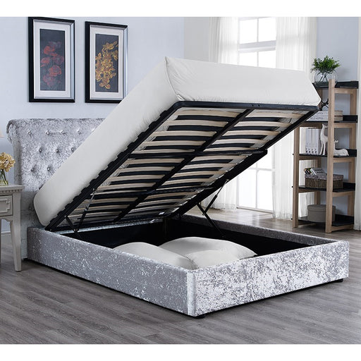View full details• Material : Velvet• Finish : Grey• High footend crushed velvet upholstered storage bed• Suitable for UK standard mattress• Assembly required• We d...