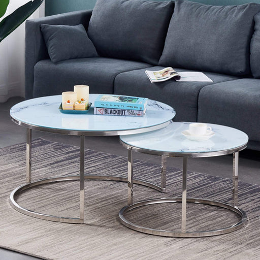 View full detailsFEATURES :• Material : Artificial Marble, Stainless Steel• Finish : White, Silver• Round Coffee Table Set• White Artificial Marble Top• Stainless S...